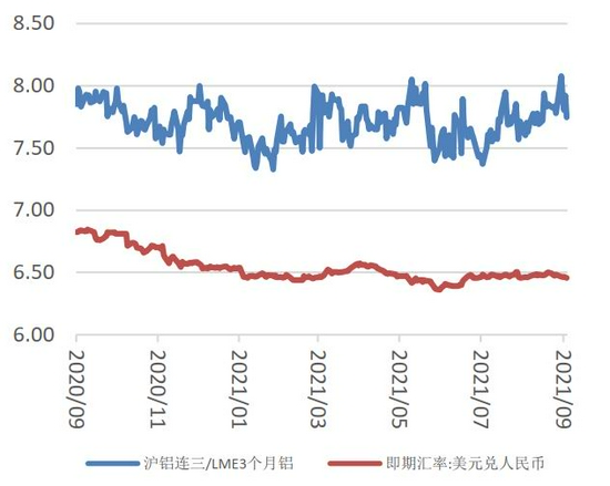 供需来看,上游铝土矿和氧化铝近期上涨较快,将会明显抬升电解铝成本;电解铝受能耗双控政策影响,年内新增产能预期或落空,在产产能受限电等因素影响,产量或不及市场预期;国家第三轮抛储铝锭顺利,年内预计还会继续抛储,电解铝库存处于年内低位,库存压力不大。下游方面,铝加工企业8月开工率受限电水灾疫情影响有所下滑,9月关注消费旺季到来;出口方面,出口利润较好,铝材7月出口继续增长;沪伦比值走高,铝材进口处于年内高位水平。