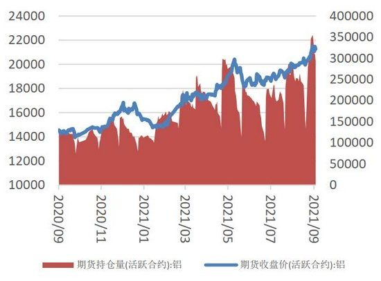 图1 沪铝主力价格(元/吨)与持仓量(手)