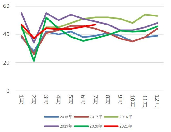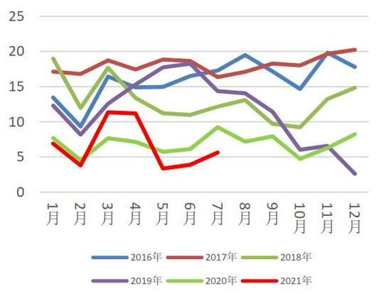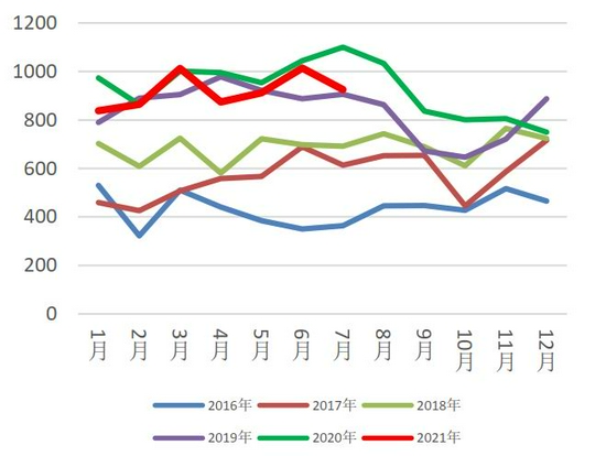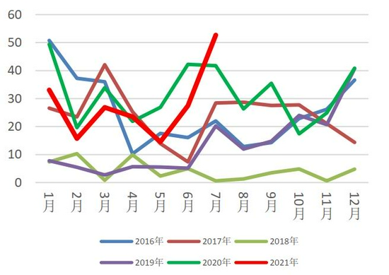 据最新海关数据显示,2021年7月进口废铝5.63万吨,同比减少39%,环比增加44.77%。2021年1-7月累积进口46.31万吨,同比减少3.7%。进口减少一方面是由于现今海关的报关再度严厉许多,许多货物被退港;另一方面是国外价格坚挺,与国内现货价格调整不同步,利润空间减少,并现货到港需时限,难以套保,需承受价格下跌带来的风险。