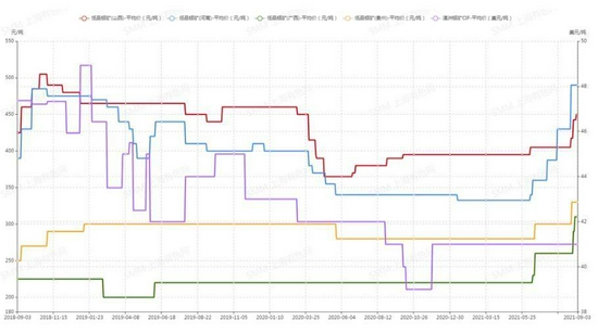 国产铝土矿整体供给仍然偏紧,价格高位运行呈常态化,目前进口矿价格上涨,与国产矿相比优势不足,未能削弱国产矿的需求,料短期国产矿价格将继续稳中有涨。另外,氧化铝价格激增,提振了厂家生产信心,若氧化铝价格稳定上行,打开利润空间,氧化铝厂也会相对容易接受当前国产矿价居高不下的局面。截至9月初,山西晋北地区铝硅比5.0,氧化铝含量60%的铝土矿含增值税不含资源税到厂价在395-412元/吨,山西孝义地区在430-475元/吨。河南三门峡地区铝硅比5.0,含铝量60%的铝土矿含增值税不含资源税,矿石成交价格上涨至480-500元/吨附近。贵州地区铝硅比5.5,氧化铝含量58%的矿石不含税价格在310-350元/吨,但高品质矿石采购难度升级。广西地区铝硅比6.0,氧化铝含量53%的矿石不含税价格在270-310元/吨,当地矿石供给处于紧平衡状态,推动价格上行。