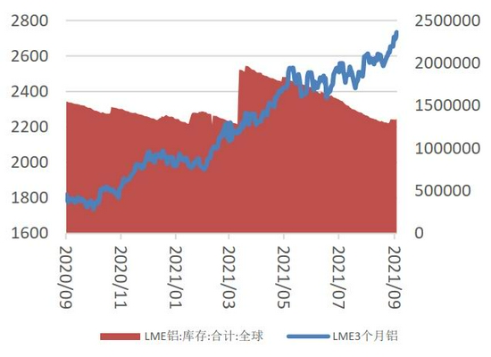 图3 LME3个月铝价(美元/吨)及库存(吨)