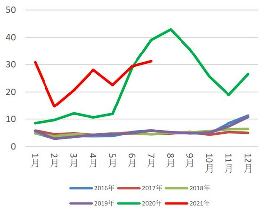 2021年7月中国未锻轧铝及铝材出口46.9万吨,环比增加3.22%,同比增加25.7%,6月为45.44万吨;1-7月份累计进口量为308.5万吨,同比增加12.7%。其中主要增量体现在铝材上,包括铝粉、铝制条杆及型材、铝丝、铝板带、铝箔及铝管。2021年7月铝材出口量为45.94万吨,环比增加1.53万吨,较7月增长了3%,同比增长26%。7月未锻轧非合金铝(含铝量99.95%及以上)虽环比增长488%,同比增长588%,实际增长量不过0.036万吨。
