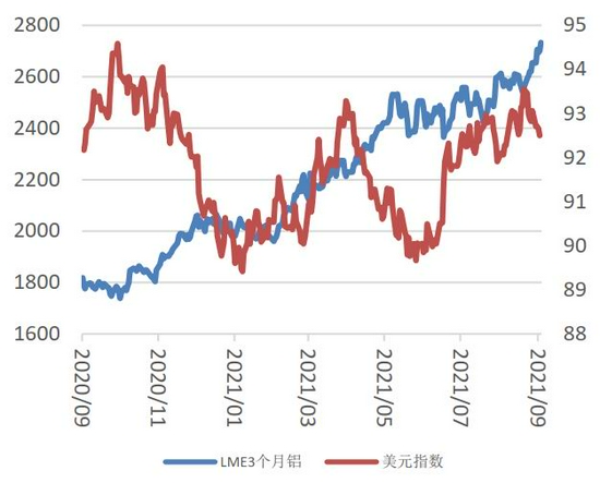 图7 伦铝价格(美元/吨)与美元指数
