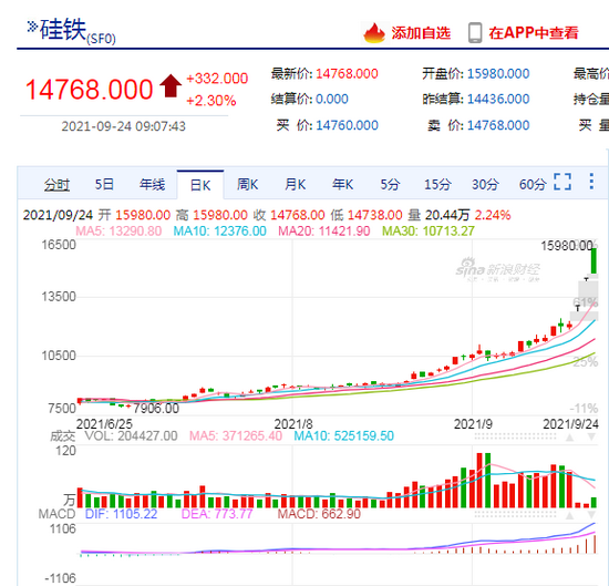 9月24日,国内期市开盘,硅铁主力合约高开超10%,随后跳水涨幅收窄至2%。锰硅跌逾5%。