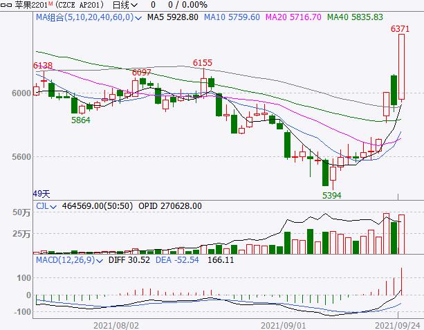 中秋节过后,短短三个交易日,其中有两个交易日,苹果期货均涨停,并且量价齐升。周五,苹果期货主力2201合约涨停,收盘报于6371元/吨,“小苹果”为何突然如此强势?