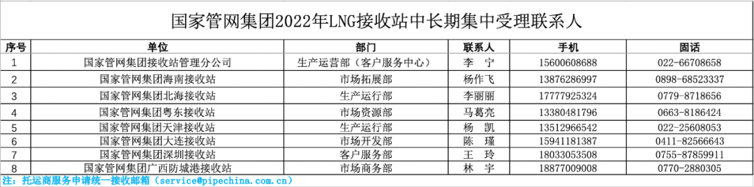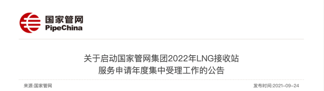 SHPGX导读:按照《油气管网设施公平开放监管办法》(发改能源规〔2019〕916号)有关要求,为践行服务国家战略、服务人民需要、服务行业发展的企业宗旨,国家管网集团计划于2021年9-11月开展2022年LNG接收站服务申请年度集中受理(以下简称年度集中受理)工作。具体事项公告如下。
