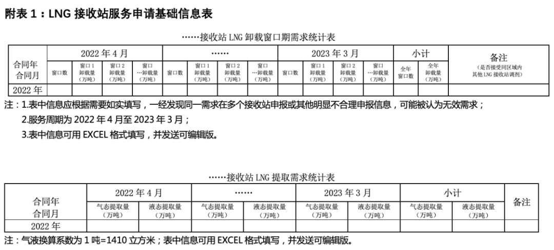 1.各LNG接收站2022年4月至2023年3月剩余能力及基础设施服务价格可通过国家管网集团官方网站公平开放专栏查询;