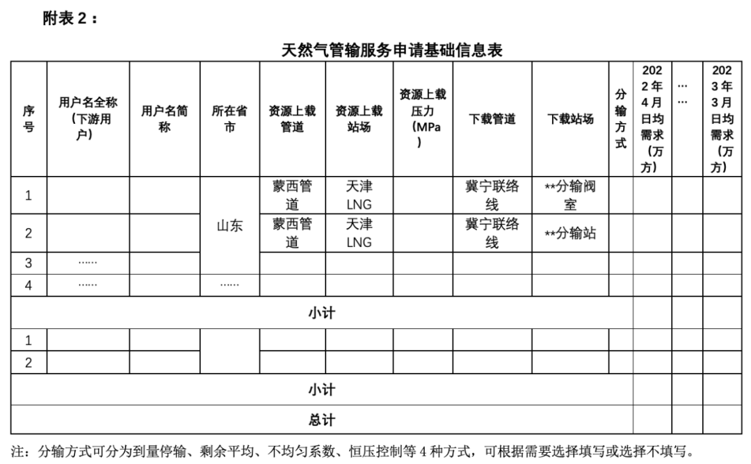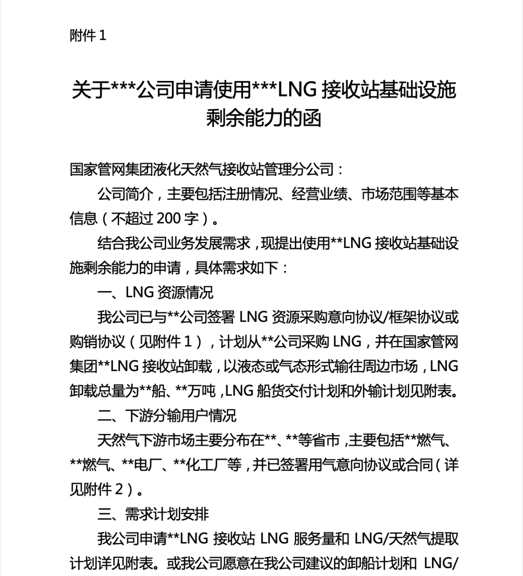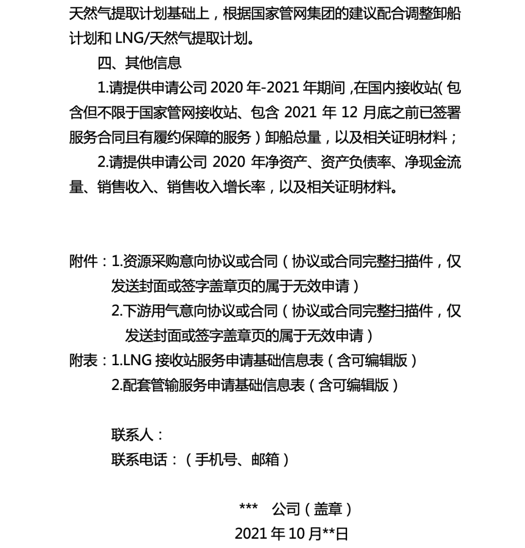 2.各公司需严格按照《关于***公司申请使用***LNG接收站基础设施剩余能力的函》(详见附件1)规定的模板和内容提交服务申请,若提供的信息不完整或服务申请未盖章,则可能被视为无效申请;