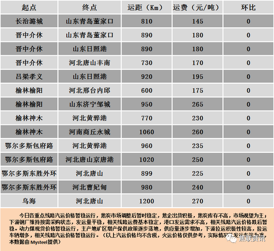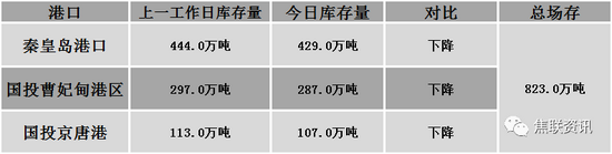 秦皇岛港铁路调入37.8万吨,装船52.8万吨,场存429.0万吨,锚地煤炭船舶64艘,预到23艘;国投曹妃甸港铁路调入18.5万吨,装船28.5万吨,场存287.0万吨,锚地煤炭船舶22艘,预到6艘;国投京唐港铁路调入11.8万吨,装船17.8万吨,场存107.0万吨,锚地煤炭船舶16艘,预到1艘。