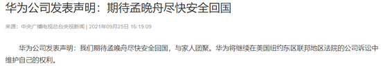 9月25日,华为公司发表声明称:“我们期待孟晚舟尽快安全回国,与家人团聚。华为将继续在美国纽约东区联邦地区法院的公司诉讼中维护自己的权利。”