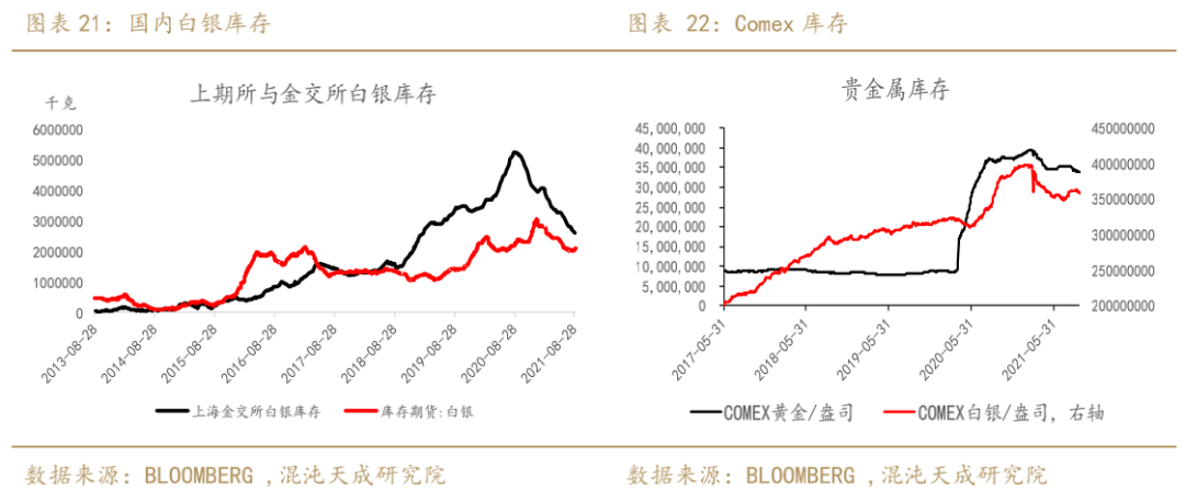 国内白银库存过去1年下降了有一半,但是伦敦和纽约的白银库存高达5万吨,除非看到这两个地方出现明显去库的现象,否则光伏之于白银只是一个锦上添花的效果而已。