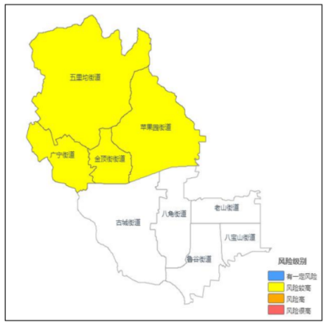 据石景山区气象台消息,未来48小时,石景山区五里坨街道、广宁街道、金顶街街道、苹果园街道发生滑坡、崩塌、泥石流等地质灾害的风险较高,特发布地质灾害气象风险黄色预警。请注意防范。