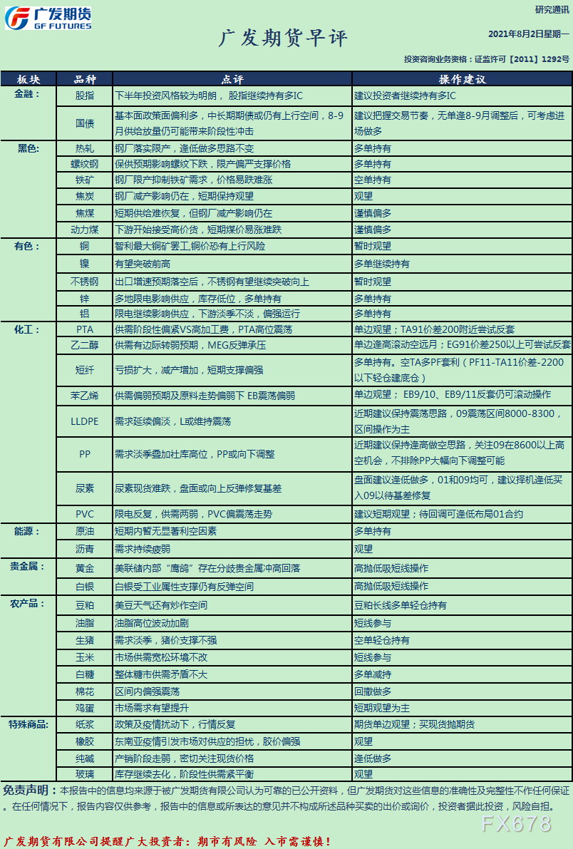 8月2日广发期货早评:股指、国债、黑色、有色、化工、轻工、农产品;