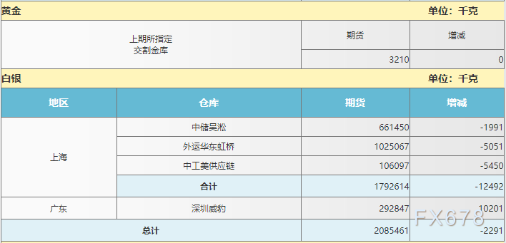 沪金期货、沪银期货9月24日上期所“仓单日报”;上海期货交易所指定交割仓库期货9月24日仓单日报显示,黄金期货总计3210千克,今日仓单无变化;白银期货总计2085461千克 (即2085.461吨),今日仓单减少2291千克;