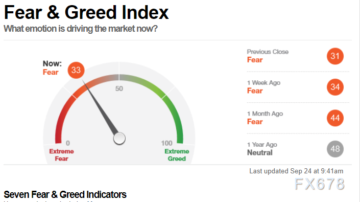 CNN恐惧与贪婪指数周五(9月24日)读数33,表明市场处在恐慌状态,较上一交易日上升4;注:CNN恐惧与贪婪指数,和“VIX恐慌指数”差不多的功能;当CNN恐惧与贪婪指数处在贪婪状态,相当于VIX恐慌指数处在低位,利好风险资产,不利避险资产;相反,CNN恐惧与贪婪指数处在恐惧状态,相当于VIX恐慌指数处在高位,不利风险资产,利好避险资产;(请点击看大图)