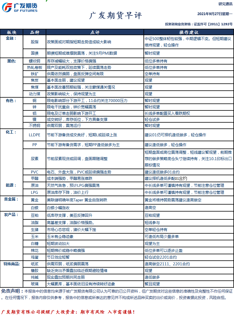 广发期货9月27日早评(一张图):股指、国债、黑色、有色、化工、轻工、农产品、能源和贵金属;