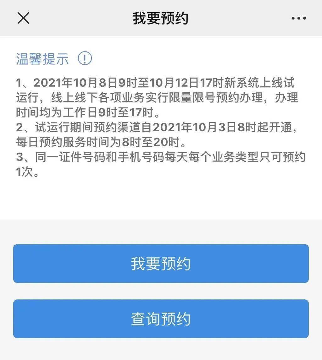 10月3日起每天的8:00~20:00可进行预约,办理时间为试运行期工作日9:00~17:00。
