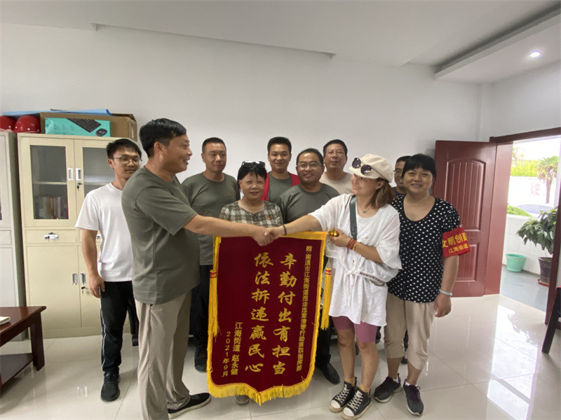 在拆违一线、在微信朋友圈我们处处都能看到百姓竖起的大拇指,甚至许多拆违对象也对我们街道干部与百姓想在一起、干在一起的务实担当作风予以了肯定和支持,纷纷送上了锦旗,感谢他们的辛勤付出!