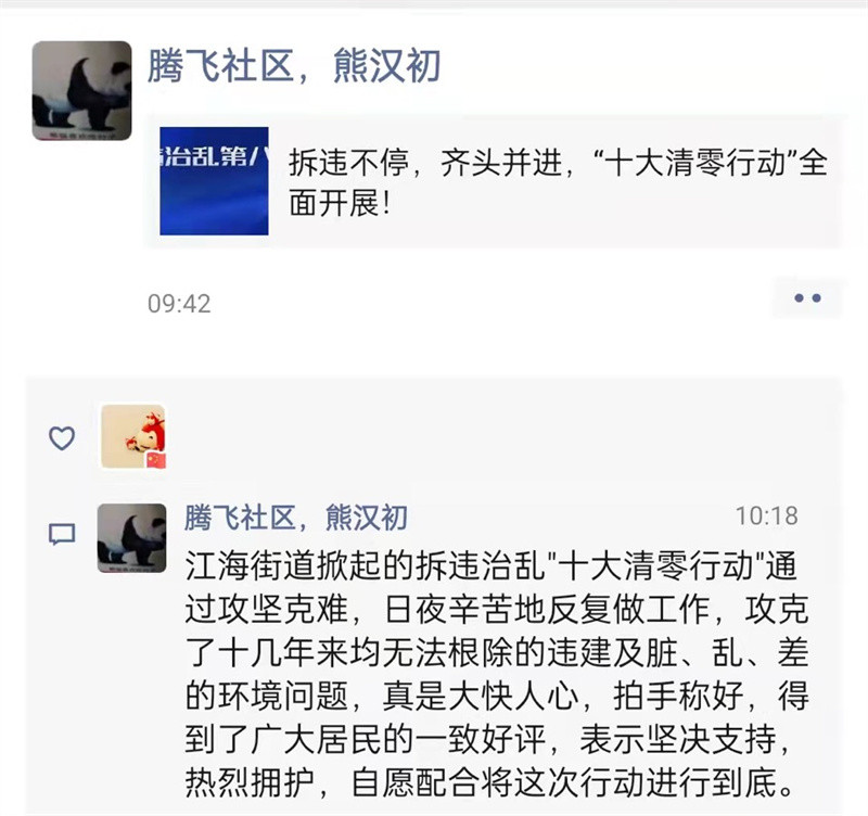 作为腾飞社区文明城市长效管理志愿者,无职上岗老党员熊汉初,始终发挥党员先锋作用、退岗却不褪色!他对此次拆违治乱行动表示坚决支持并直呼大快人心!