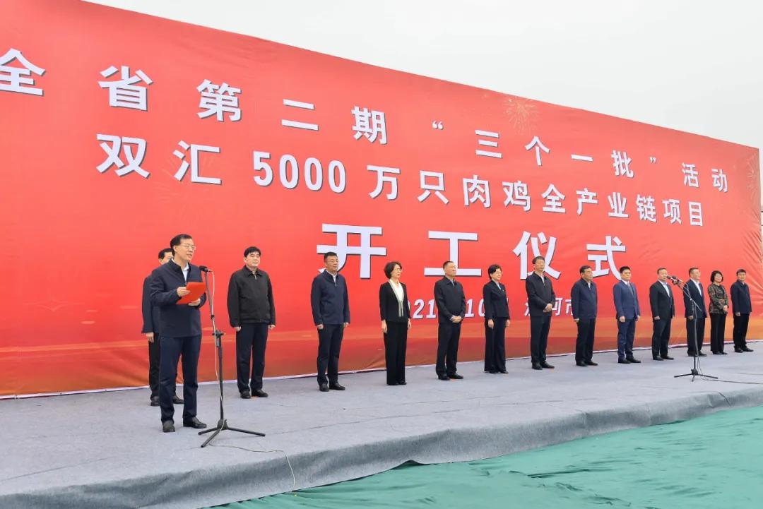 10月8日,全省第二期“三个一批”活动双汇5000万只肉鸡全产业链项目开工奠基仪式在漯河市双汇第二工业园隆重举行。漯河市市委书记刘尚进、市长秦保强,双汇发展总裁马相杰等政府和企业领导出席仪式,仪式由市长秦保强主持。