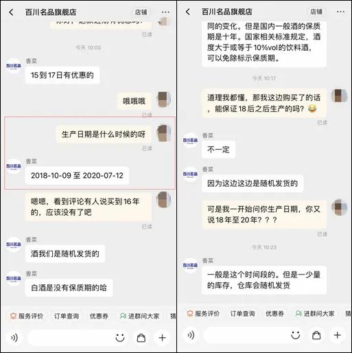 随后,《消费者报道》以消费者身份咨询客服新上架的上述白酒生产日期时,对方表示,生产日期为2018年10月9日至2020年7月12日。当本刊询问为何很多人都收到了2016年生产的产品时,客服则称,“酒是我们随机发的”。而本刊以中秋送人为由,问能否保证到货的是2018年至2020年生产的产品时,对方却称不一定。本刊因此质疑其为何一开始告知生产日期为2018年至2020年,对方却改口称,“一般是这2018年至2020年的,但是有少量的库存,仓库会随机发货。”