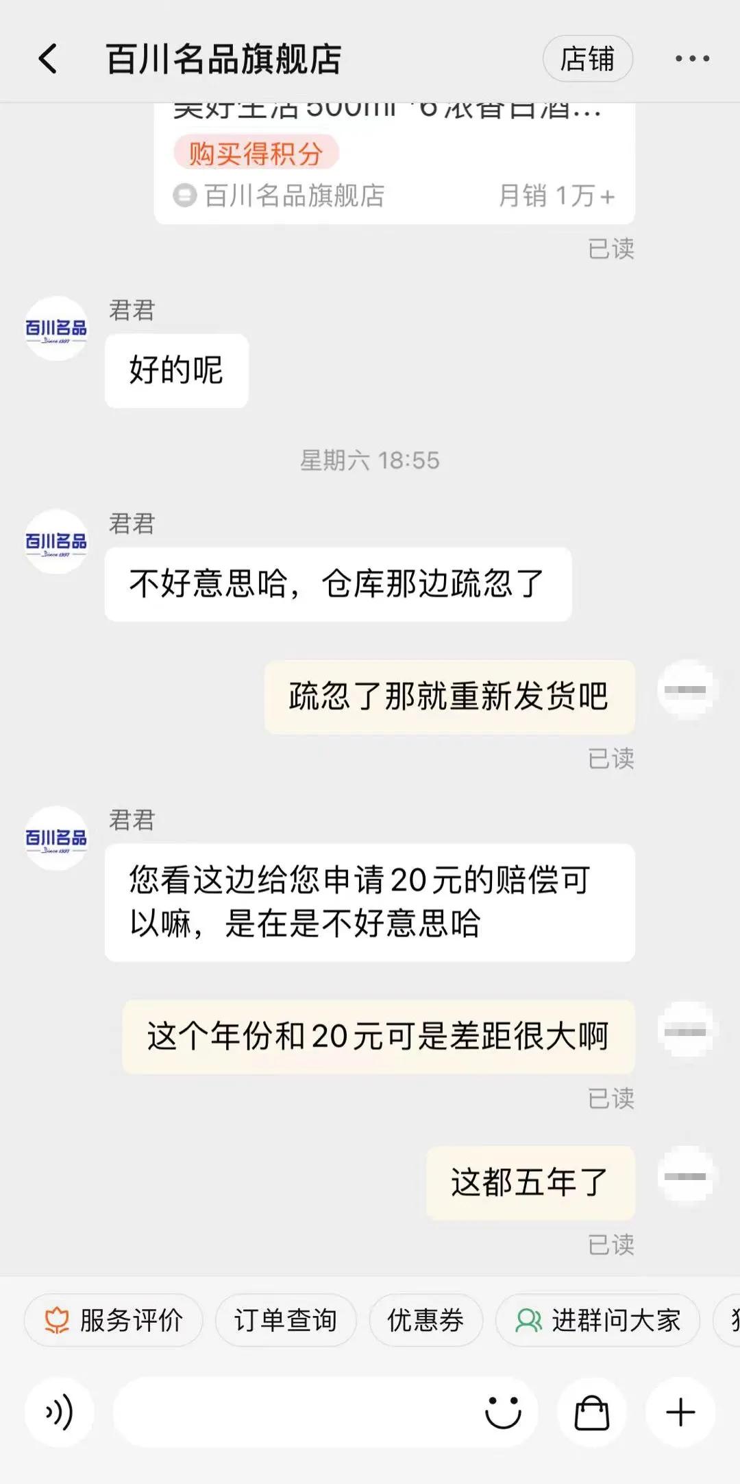 与此同时,小梅也向百川名品方面反映了情况,百川名品客服则回应称,是仓库疏忽了,并表示可为小梅申请20元的赔偿。不过,小梅拒绝了此方案,她告诉本刊,“这是低度酒,不宜长期储存。这本来就是清库存的货,而且箱子都长毛了,给我100元也不会要的。”