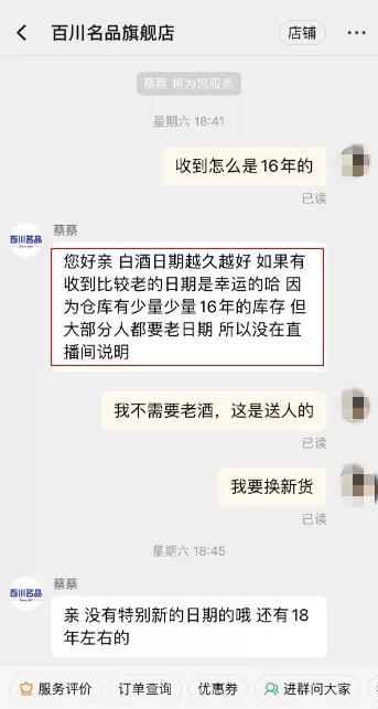 《消费者报道》在黑猫投诉平台检索发现,有消费者称咨询百川名品旗舰店的客服时,客服表示,“白酒日期越久越好,如果有收到比较老的日期是幸运的。”该名客服还称,“因为大部分人都要老日期,所以没在直播间说明”。