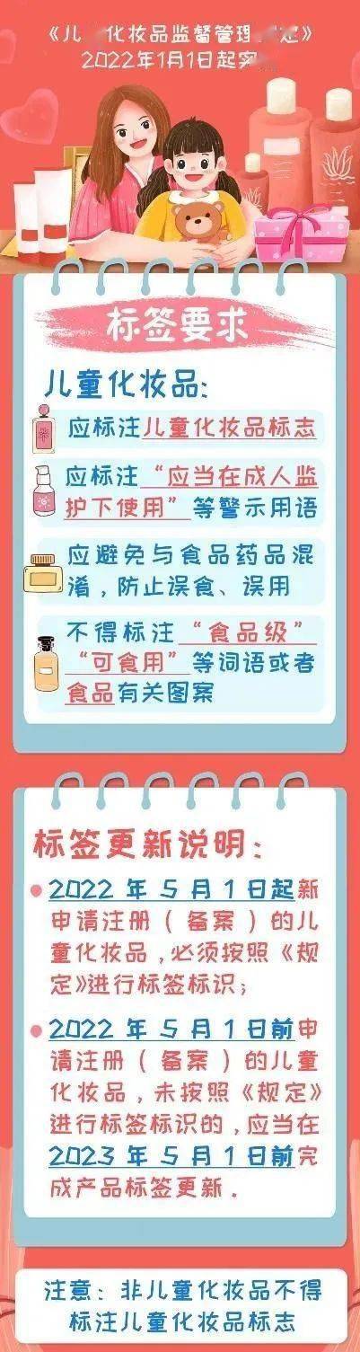 除标签的要求以外,其他关于儿童化妆品的规定自2022年1月1日起施行。