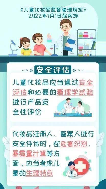 第八条:儿童化妆品应当通过安全评估和必要的毒理学试验进行产品安全性评价。化妆品注册人、备案人对儿童化妆品进行安全评估时,在危害识别、暴露量计算等方面,应当考虑儿童的生理特点。