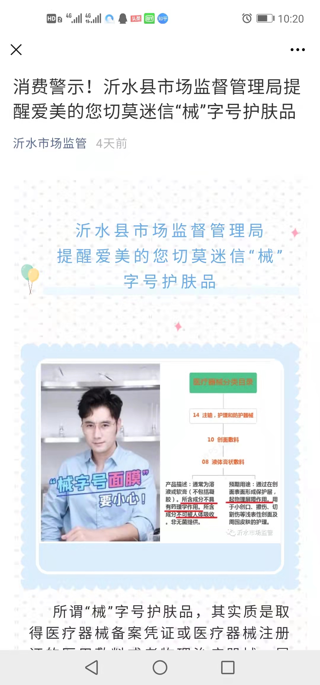 加大宣传,增强意识保安全。为增强消费者对化妆品与可用于医疗美容医疗器械的识别能力,按需选择护肤品,沂水县市场监督管理局发布消费警示,科普宣传化妆品与医疗器械相关知识,增强消费者的辨识能力,提醒消费者增强自我保护意识,不要迷信“械”字号护肤品。