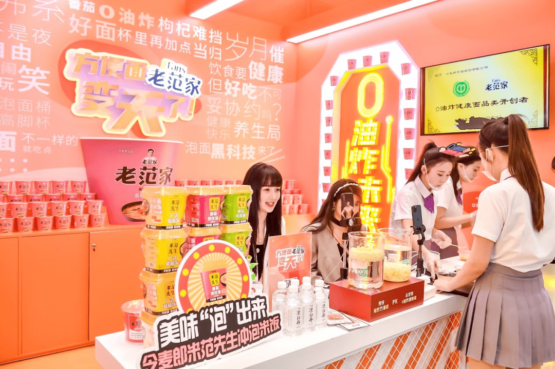 记者在本届大会的方便食品展上看到,今麦郎展区品牌旗下“老范家0油炸健康面”“米范先生冲泡米饭”等明星产品集中亮相。
