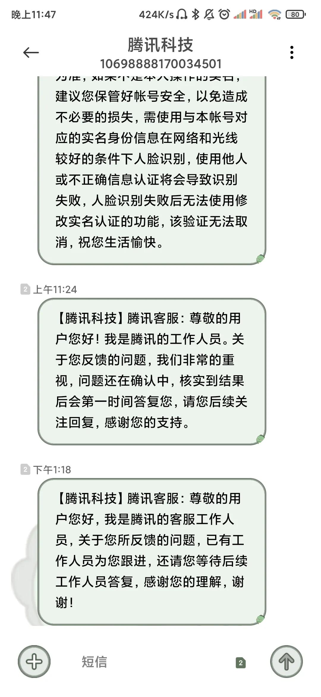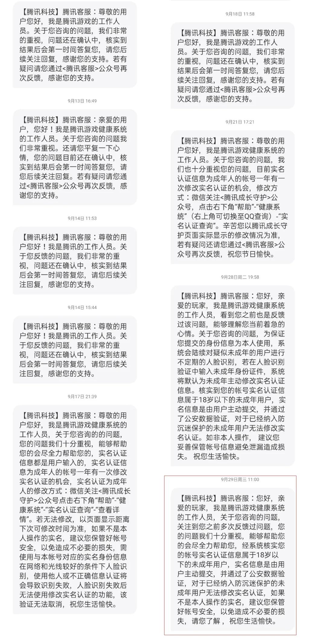 “这些都是腾讯客服发给我的短信回复,所有人的都是一模一样”袁先生说道。