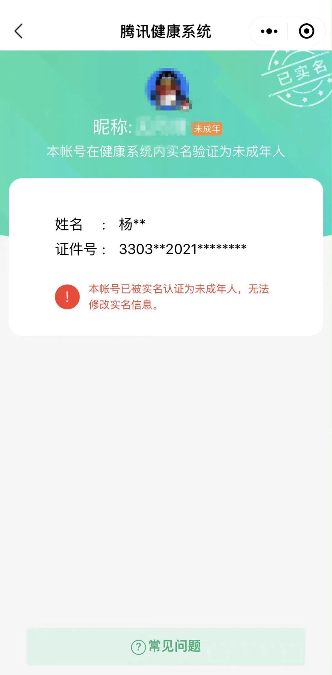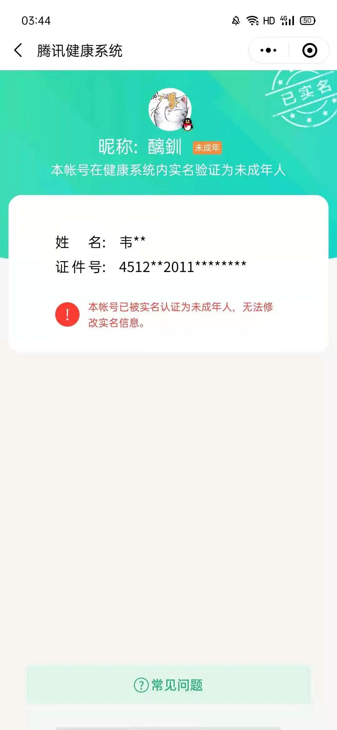 经查询后,袁先生才发现自己的腾讯健康系统的认证信息被篡改成了未成年人。袁先生向本刊称,他从未收到任何提醒修改的信息。