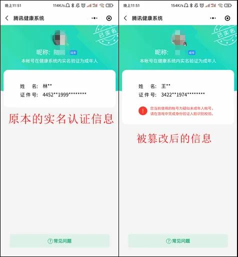 另外,林先生还向《消费者报道》反映称,自从9月6日腾讯健康系统升级后,便有大批玩家出现实名认证信息被恶意篡改的情况。他怀疑账号被恶意篡改可能与此次升级存在漏洞有关。