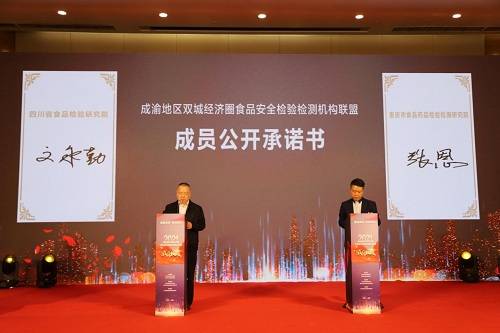 在启动仪式上,四川省市场监管局副局长周传军发表致辞,重庆市市场监管局副局长杨光宣读《成渝地区双城经济圈食品安全检验检测机构联盟工作章程》。与会人员推选并表决通过“四川省食品检验研究院”为联盟首届理事长单位,“重庆市食品药品检验检测研究院”为副理事长单位。随后理事长单位、副理事长单位代表首批28家成员单位上台宣读并签署《成渝地区双城经济圈食品安全检验检测机构联盟成员公开承诺书》。