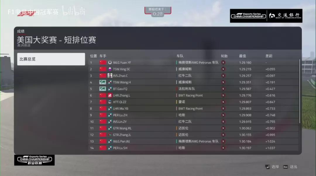 WLG.袁一帆在12分钟排位赛最后一个冲刺圈中做出了1m29.160s的最快圈速,从TSW.邢思成手中拿下了美利坚赛道的杆位。INS.卓超和TSW.王浩占据了第二排发车位置。
