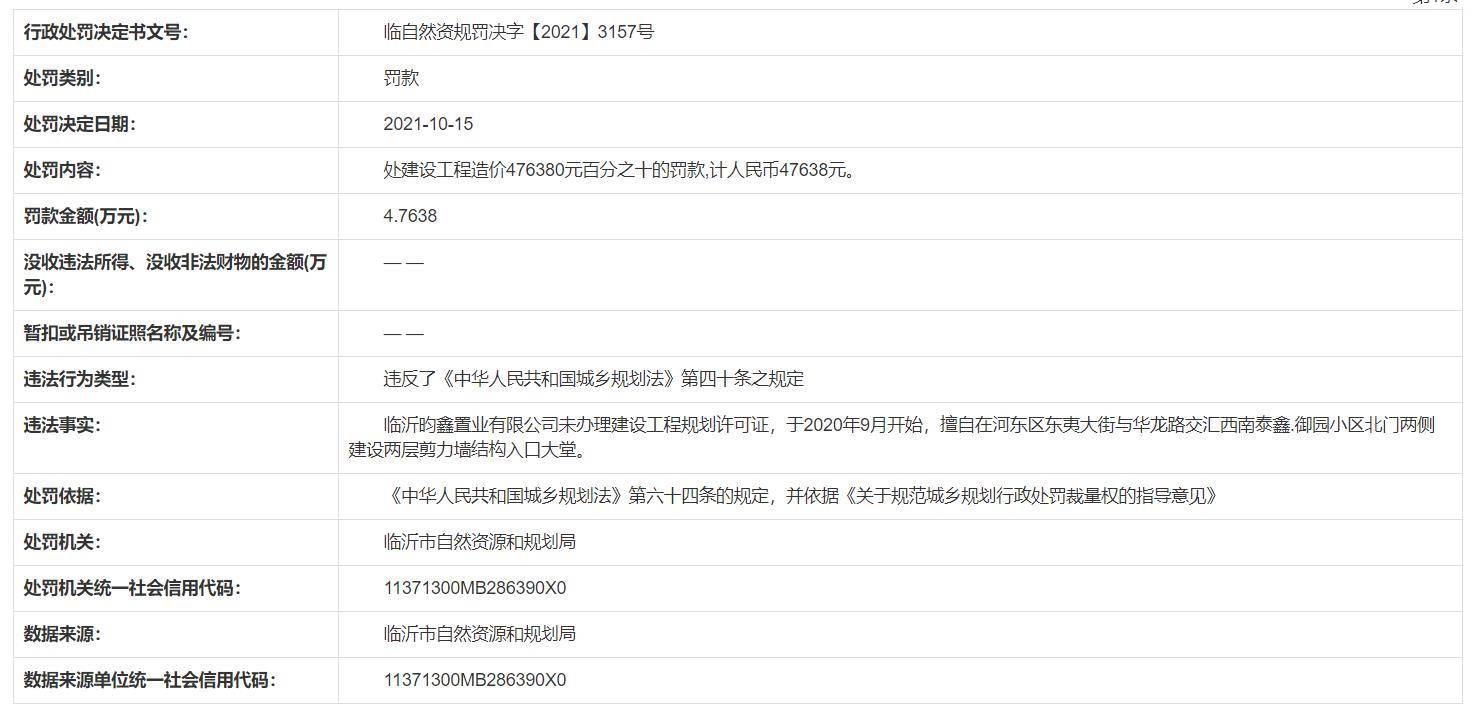 10月15日,临沂市自然资源和规划局发布行政处罚通告,临沂昀鑫置业有限公司因未取得建设工程规划许可证擅自施工被罚款47638元。
