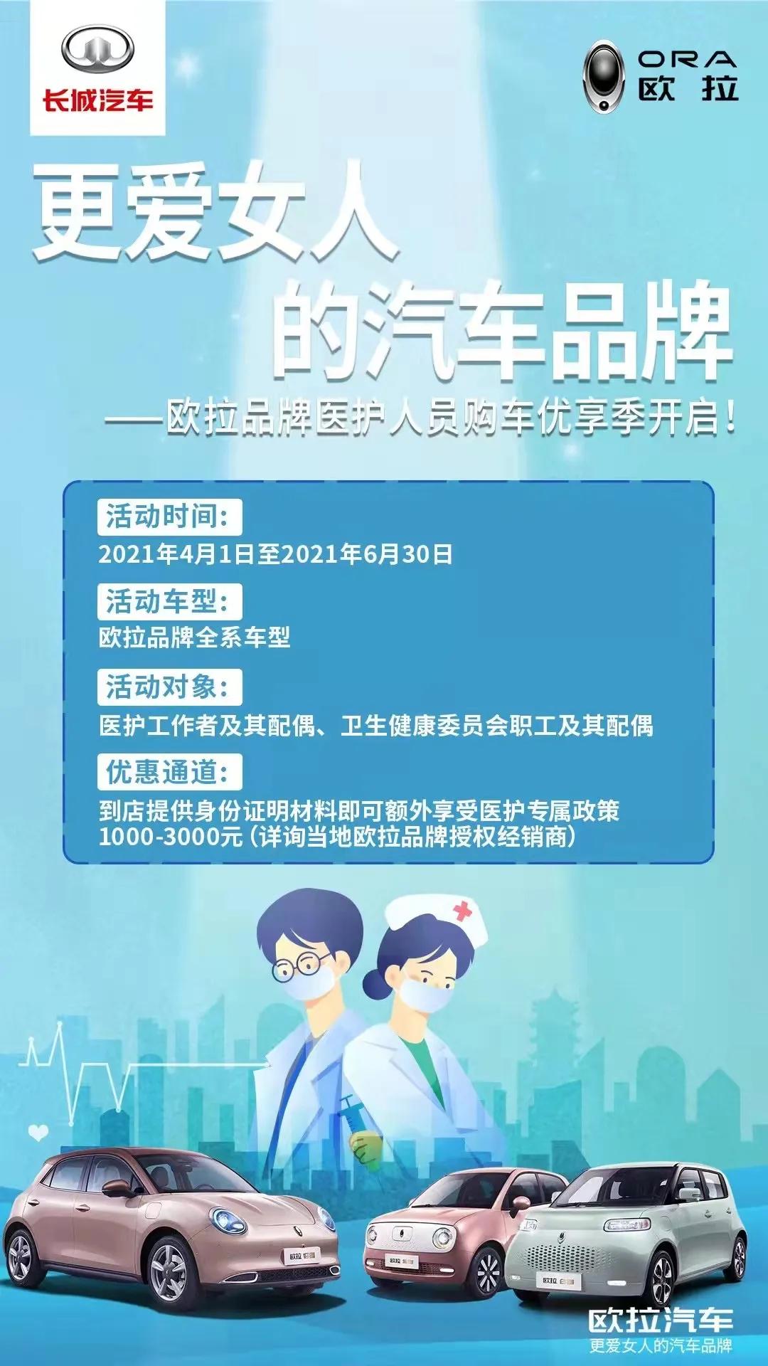 徐先生提到的优惠活动,是长城欧拉推出的“欧拉品牌医护人员购车优享季”活动,时间从2021年4月1日至2021年6月30日,活动范围涵盖欧拉全系车型,符合条件的消费者提供相应的证明即可享受1000元至3000元的额外优惠,以发票开具时间为准。换言之,要在活动期间开具发票和提车才能获得优惠。