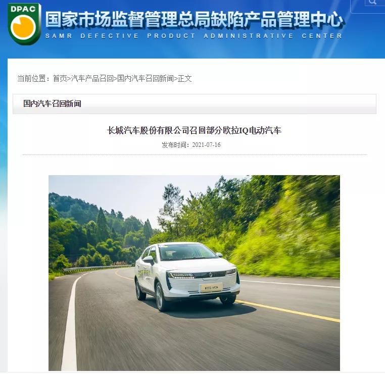 ▲长城欧拉召回部分iQ汽车(来源:国家市场监督管理总局缺陷产品管理中心)