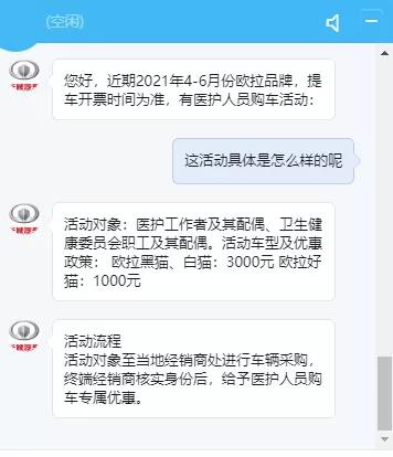 ▲长城欧拉客服人员对医护人员专属优惠活动的解释